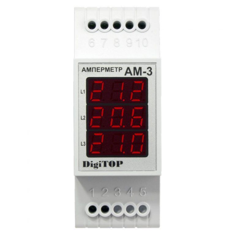 Цифровий Амперметр АМ-3 призначений для вимірювання змінного струму частотою 50 (±1) Гц в трифазній мережі з відображенням поточних значень на цифрових світлодіодних індикаторах. Вимірювання сили струму проводиться за допомогою зовнішніх трансформаторів струму (поставляються в комплекті).