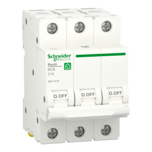 Мініатюрний автоматичний вимикач Resi9. Це 3-полюсний вимикач (три полюси захищенні), з номінальним струмом 10 A та кривою відключення С. Номінальна відключаюча здатність становить до 6000 А при напрузі 400 В АС відповідно до стандарту EN/Мек 60898-1. Цей продукт відповідає стандарту EN/Мек 60898-1. Автоматичний вимикач захищає коло від струму короткого замикання та перевантаження. Resi9 призначений для житлового будівництва. Він має електричну витривалість до 10000 циклів і механічну витривалість до 20000 циклів. Робоча напруга Ue становить 400 В змінного струму. Номінальна напруга ізоляції Ui становить 440 В змінного струму. Робоча частота 50 Гц або 60 Гц. Його можна встановити на DIN-рейку. Його ширина становить 6 кроків по 9 мм. Колір виробу білий (RAL9003). Розміри (Ш) 54 мм х (В) 81 мм х (Г) 72 мм. Відповідно до стандарту Мек 60529, ступінь захисту IP20 і IP40 В щиті. Робоча температура від -25°C до 60°C. Температура зберігання від -40°C до 60°C.