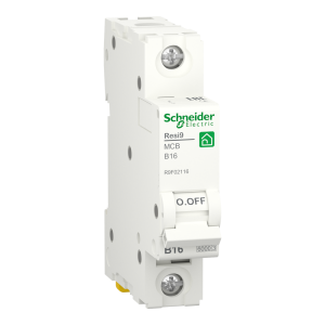 Мініатюрний автоматичний вимикач Resi9. Це 1-полюсний вимикач, з номінальним струмом 16 A та кривою відключення В. Номінальна відключаюча здатність становить до 6000 А при напрузі 230 В АС відповідно до стандарту EN/Мек 60898-1. Цей продукт відповідає стандарту EN/Мек 60898-1. Автоматичний вимикач захищає коло від струму короткого замикання та перевантаження. Resi9 призначений для житлового будівництва. Він має електричну витривалість до 10000 циклів і механічну витривалість до 20000 циклів. Робоча напруга Ue становить 230 В змінного струму. Номінальна напруга ізоляції Ui становить 440 В змінного струму. Робоча частота 50 Гц або 60 Гц. Його можна встановити на DIN-рейку для модульної установки. Його ширина становить 2 кроки по 9 мм. Колір виробу білий (RAL9003). Розміри (Ш) 18 мм х (В) 81 мм х (Г) 72 мм. Відповідно до стандарту Мек 60529, ступінь захисту IP20 і IP40 В щиті. Робоча температура від -25°C до 60°C. Температура зберігання від -40°C до 60°C.