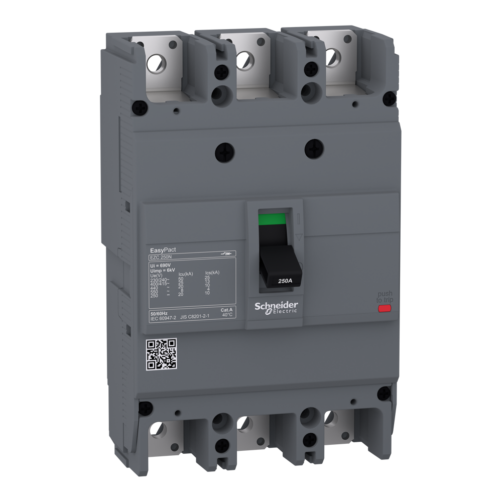 EasyPact EZC250N - це 3-полюсний фіксований автоматичний вимикач, призначений для захисту електроустановок низької напруги. Він використовується для стандартних застосувань у промисловості та будівлях, пропонуючи хорошу продуктивність за конкурентоспроможною ціною. Відключаюча здатність (Icu) становить 25 кА середньоквадратичного значення при 415 В змінного струму 50/60 Гц. Робоча напруга становить 550 В змінного струму 50/60 Гц або 250 В постійного струму. Номінальний струм термомагнітного розчіплювача становить 160 А. Вимикач забезпечує фіксований захист від перевантаження та миттєвий захист від надструму. Ця версія з 3 полюсами (105 мм x 165 мм x 60 мм) поставляється з різними додатковими функціями та аксесуарами. Easypact EZC250N відповідає міжнародним стандартам (IEC 60947, UL 508) і морським сертифікатам.