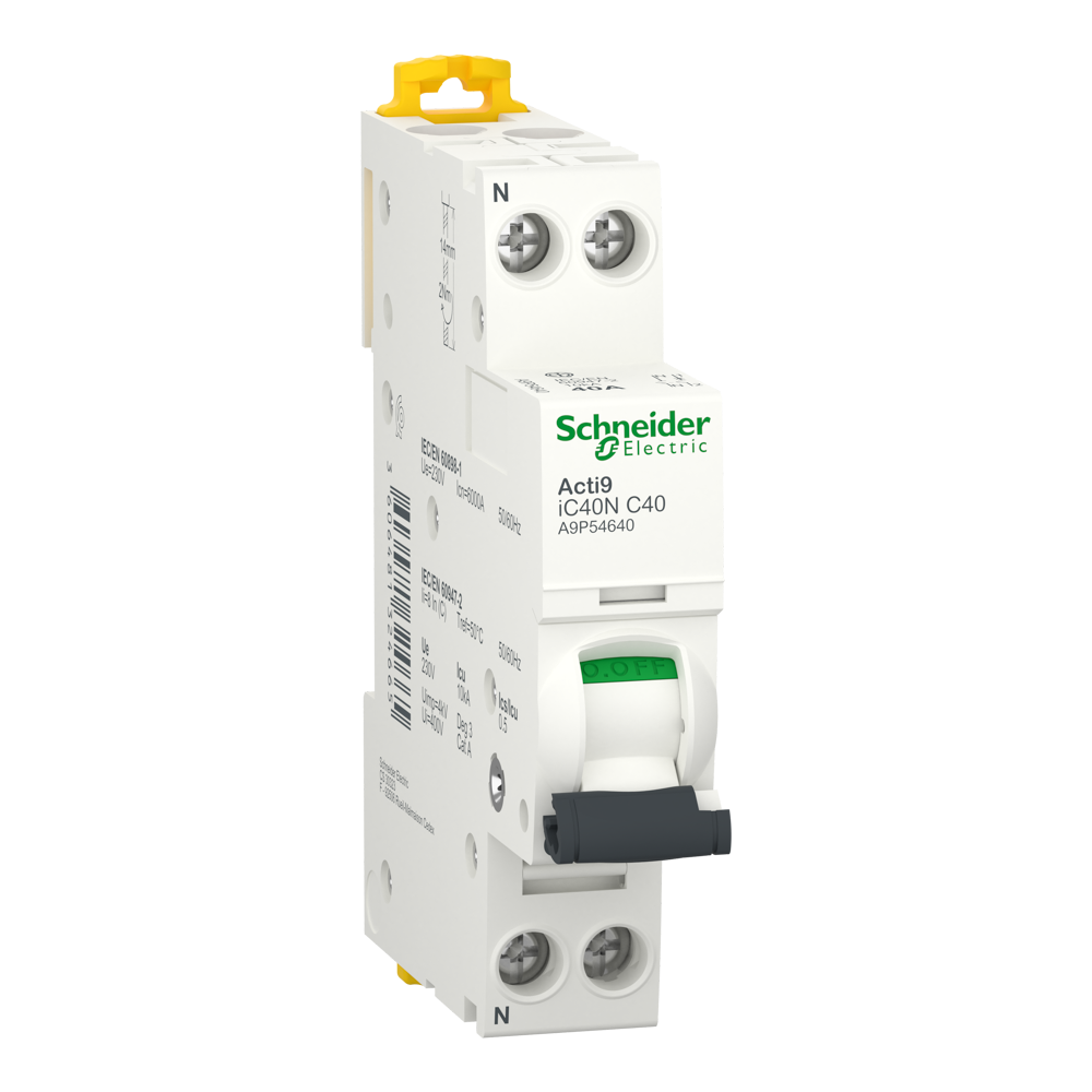 Acti9 iC40N - це модульний автоматичний вимикач. Кількість полюсів 1P+N, номінальний струм 40 А, крива відключення С. Номінальна відключаюча здатність до 6000 А при 230 В змінного струму (Мек 60898-1) та 10000 А при 230 В змінного струму (Мек 60947-2). Автоматичний вимикач поєднує в собі функції захисту електричного кола від короткого замикання та струму перевантаження, керування та ізоляції. Встановлення автоматичного вимикача та підключення кабелів до нього спрощено, завдяки встановлення на DIN-рейку затисканням. Електрична зносостійкість до 10 000 циклів і механічна зносостійкість до 20 000 циклів. Номінальна робоча напруга Ue 230 В змінного струму. Номінальна напруга ізоляції Ui 400 В змінного струму. Номінальна імпульсна витримувана напруга Uimp 4 кВ. Робоча частота 50 Гц або 60 Гц. Виріб призначений для встановлення на DIN-рейку. Його ширина становить 2 модулі по 9 мм. Ступінь забруднення 3. Колір білий (RAL9003). Розміри: (Ш) 18 мм x (В) 85 мм x (Г) 74 мм. Вага 120г. Має ступінь захисту IP20 (відповідно до стандарту Мек 60529) і IP40 при встановленні в щиті. Робоча температура від -25°C до 70°C. Температура зберігання від -40°C до 85°C.