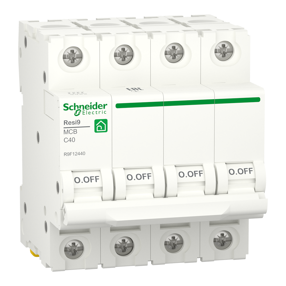 Мініатюрний автоматичний вимикач Resi9. Це 4-полюсний вимикач (чотири полюси захищенні), з номінальним струмом 40 A та кривою відключення С. Номінальна відключаюча здатність становить до 6000 А при напрузі 400 В АС відповідно до стандарту EN/Мек 60898-1. Цей продукт відповідає стандарту EN/Мек 60898-1. Автоматичний вимикач захищає коло від струму короткого замикання та перевантаження. Resi9 призначений для житлового будівництва. Він має електричну витривалість до 10000 циклів і механічну витривалість до 20000 циклів. Робоча напруга Ue становить 400 В змінного струму. Номінальна напруга ізоляції Ui становить 440 В змінного струму. Робоча частота 50 Гц або 60 Гц. Його можна встановити на DIN-рейку. Його ширина становить 8 кроків по 9 мм. Колір виробу білий (RAL9003). Розміри (Ш) 72 мм х (В) 81 мм х (Г) 72 мм. Відповідно до стандарту Мек 60529, ступінь захисту IP20 і IP40 В щиті. Робоча температура від -25°C до 60°C. Температура зберігання від -40°C до 60°C.