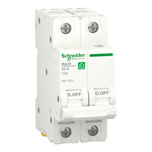 Мініатюрний автоматичний вимикач Resi9. Це 2-полюсний вимикач (обидва полюси захищенні), з номінальним струмом 50 A та кривою відключення C. Номінальна відключаюча здатність становить до 6000 А при напрузі 400 В АС відповідно до стандарту EN/Мек 60898-1. Цей продукт відповідає стандарту EN/Мек 60898-1. Автоматичний вимикач захищає коло від струму короткого замикання та перевантаження. Resi9 призначений для житлового будівництва. Він має електричну витривалість до 10000 циклів і механічну витривалість до 20000 циклів. Робоча напруга Ue становить 400 В змінного струму. Номінальна напруга ізоляції Ui становить 440 В змінного струму. Робоча частота 50 Гц або 60 Гц. Його можна встановити на DIN-рейку. Його ширина становить 4 кроки по 9 мм. Колір виробу білий (RAL9003). Розміри (Ш) 36мм х (В) 81мм х (Г) 72мм. Відповідно до стандарту Мек 60529, ступінь захисту IP20 і IP40 В щиті. Робоча температура від -25°C до 60°C. Температура зберігання від -40°C до 60°C.