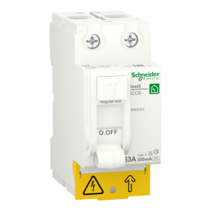 Диференційний вимикач навантаження Resi9. Це 2-полюсний вимикач з номінальним струмом 63 А, класом захисту А-S та чутливістю до витоку струму на землю 300 мА. Цей продукт захищає від ураження електричним струмом при прямому або непрямому контакті та від загоряння. Як високочутливий пристрій захисного відключення рекомендується для всіх розеток. Встановлення продукта є обов’язковим для всього обладнання у ванних кімнатах, на відкритому повітрі. Resi9 призначений для житлового будівництва. Цей продукт відповідає стандарту EN/Мек 61008-2-1. Умовний номінальний струм короткого замикання (Inc/IΔc) становить 6000 А. Номінальна вмикаюча здатність (Im/IΔm) становить 630 А. Електрична витривалість - до 10000 циклів. Механічна витривалість - до 20000 циклів. Робоча напруга Ue становить 230 В змінного струму. Його можна монтувати на DIN-рейку. The width in 9mm pitches is 4. Колір виробу білий (RAL9003). Розміри (Ш) 36 мм х (В) 82 мм х (Г) 73 мм. Має ступінь захисту IP20 та IP40 у модульному щиті відповідно до стандарту Мек/EN 60529. Робоча температура від -25°C до 40°C. Температура зберігання від -40°C до 80°C.