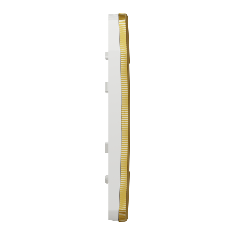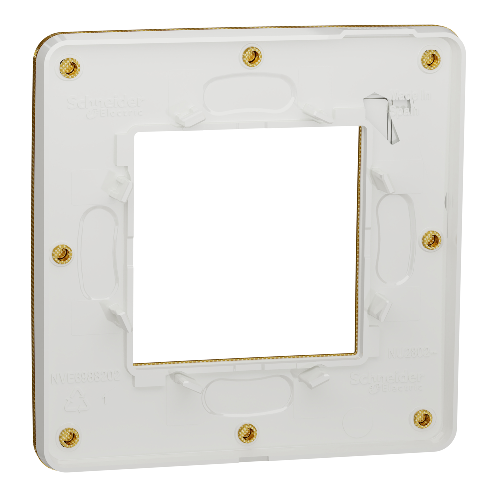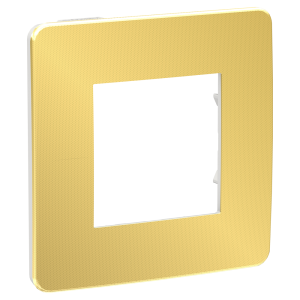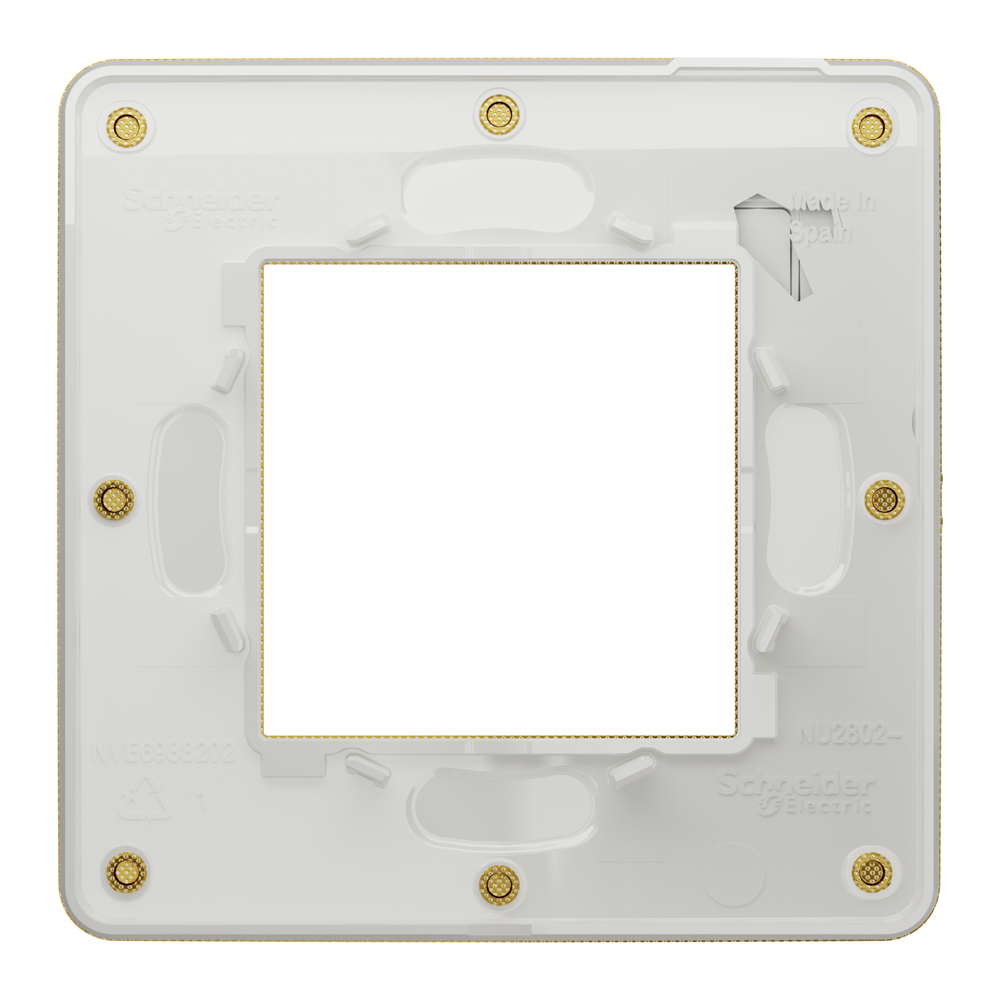 Рамка Schneider Electric New Unica NU280259 золотого/білого кольору. Рамка є екологічно чистим продуктом преміум-класу. Рамка - однопостова. Вона виготовлена з термопластику ABS-UV-стабілізованого. Ступінь ударозахисту IK04. Крім того, вона екологічно чиста, стійка до ультрафіолету, ацетону, спирту, аміаку, відбілювача, рідкого мила, масла, бензину, рідини для миття вікон. Вона не містить SVHC (особливо небезпечні речовини). Рамка входить в групу Unica Studio. Відповідає стандартам Мек 60669-1, Мек 60884-1. Її ширина 85 мм, висота 85 мм, глибина 10 мм. Вага 0,02 кг. Не містить галогенів. Спосіб кріплення: затисканням. Unica розроблена з розумними функціями, щоб бути гнучкою, простою для розуміння та швидкою для встановлення, забезпечуючи рішення для всіх вимог клієнтів.