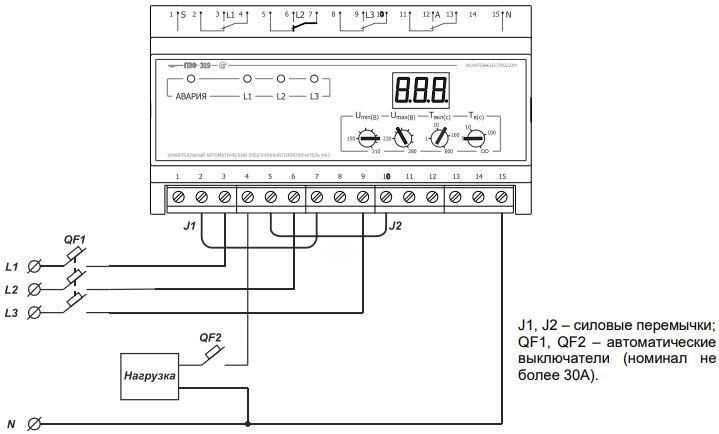 - при потужності, що перевищує 6.6 кВт (30 А), ПЕФ-319 управляє котушками магнітних пускачів (МП) відповідної потужності (МП в комплект не входять).