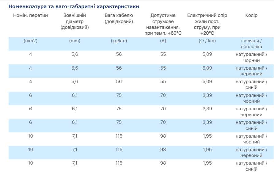 - переважна область застосування кабелю для підключення рухомих і стаціонарних компонентів (сонячні модулі, прилади тощо) фотоелектричних систем;