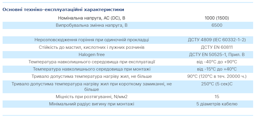 - оболонка кабелю виконана з надзвичайно зносостійкого матеріалу, стійкого до ультрафіолетового випромінювання, озону, агресивних погодних умов і гідролізу;