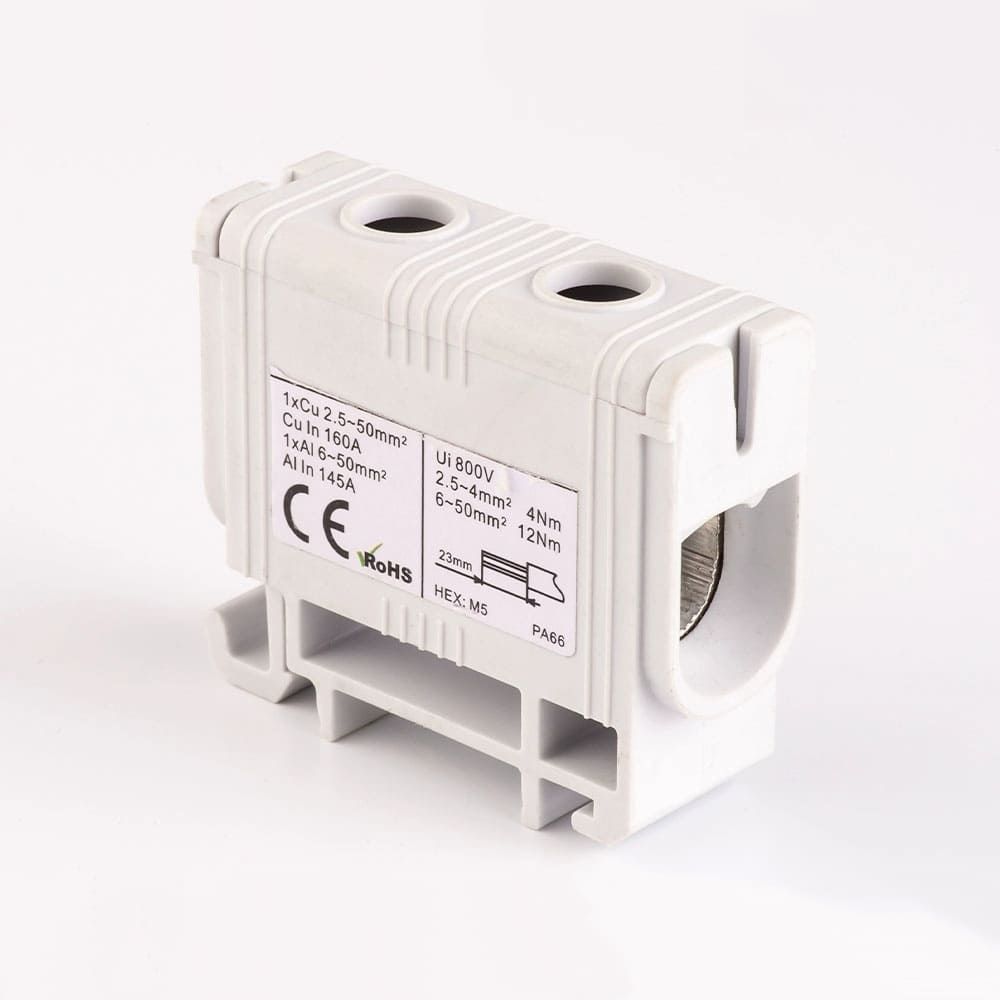 Клема силова ввідна UTB 6-50, сірого кольору - це клеми з'єднувальні гвинтові для силових провідників. Призначені для підключення упускних провідників, організації оперативних відгалужень проводів, і виконання допоміжних завдань в електро-щитовому та іншому промисловому обладнанні.