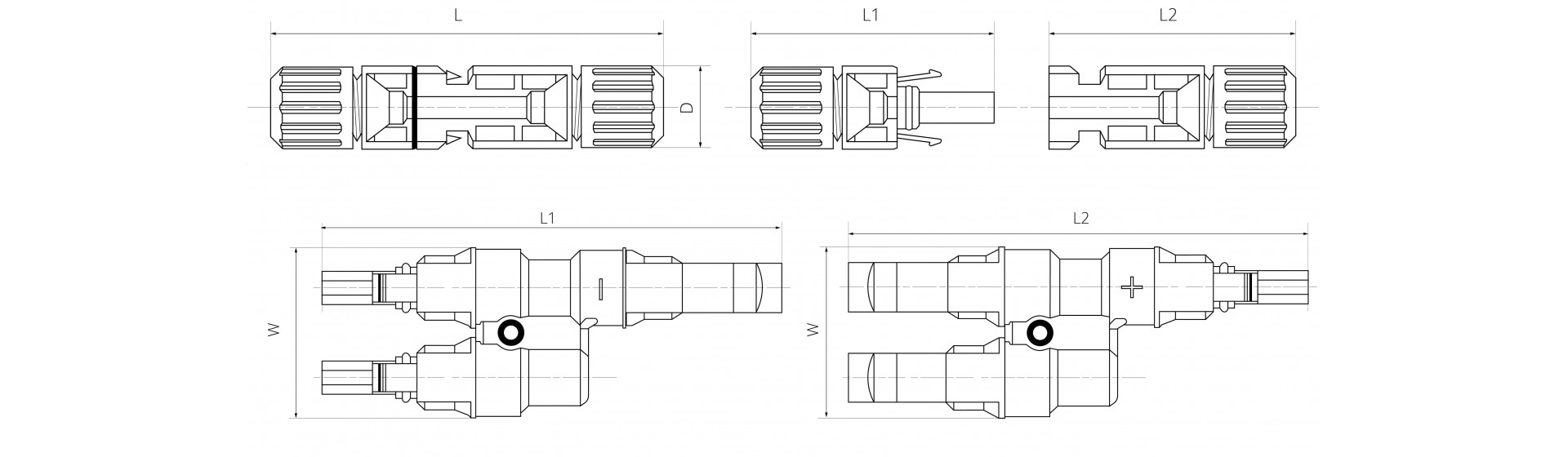 - МС4 в зборі являє собою два окремих вироби, один з яких має маркування «-», а інший маркування «+». Кожен з цих елементів конектора є закінченим виробом, так як може з'єднуватися не тільки з іншим (відповідним) виробом, а й з розгалужувачами, що мають ідентичні контактні частини.
