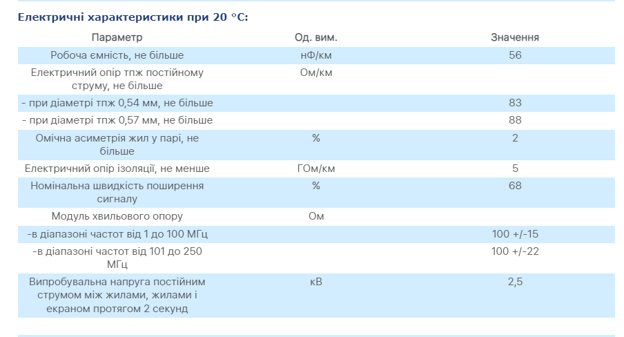 Вимога до кабелю: ДСТУ IEC 61156-5, ДСТУ EN 50288-5-1, ТУ У 27.3-05758730-097:2018