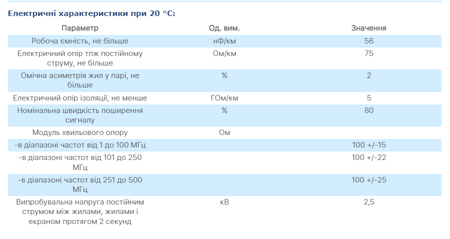 Вимога до кабелю: ДСТУ IEC 61156-5, ДСТУ EN 50288-10-1, ТУ У 27.3-05758730-097:2018