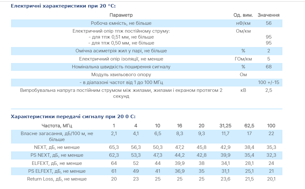 Вимога до кабелю: ДСТУ IEC 61156-5, ДСТУ EN 50288-3-1, ТУ У 27.3-05758730-100:2018