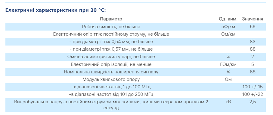 Вимога до кабелю: ДСТУ IEC 61156-5, ДСТУ EN 50288-5-1, ТУ У 27.3-05758730-097:2018