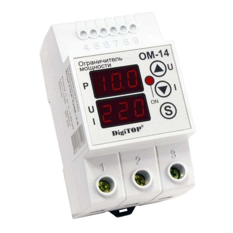 Обмежувач потужності ОМ-14 призначений для контролю потужності що споживається в однофазній електричній мережі. Прилад управляється мікроконтролером, який аналізує напругу в електромережі, споживаний струм і обчислює потужність підключеного навантаження з відображенням значень на цифрових індикаторах. Допустима межа потужності, час затримки включення/вимикання і кількість циклів спрацьовування встановлюються користувачем. Прилад обладнаний функцією реле напруги, параметри якого (верхня і нижня межі напруги) також встановлюються користувачем. Всі встановлені значення зберігаються в енергонезалежній пам’яті. Кріплення приладу здійснюється на монтажний профіль TS-35
