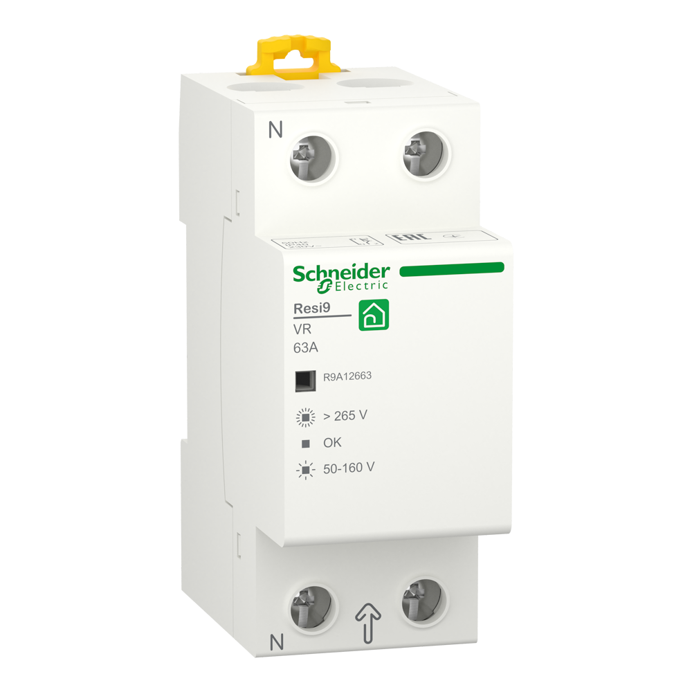 Реле напруги Resi9. Має 1P+N з номінальним струмом 63 А. Відключення від перенапруги становить 265 В АС і від 50 до 160 В AC для відключення за низькою напругою. Порогове значення відновлення перенапруги становить 253 В АС та 195 В АС для порогу відновлення низької напруги. Номінальна робоча напруга Ue становить 230 В змінного струму. Номінальна напруга ізоляції Ui становить 400 В змінного струму. Він має номінальну імпульсну напругу, що витримується Uimp 4 кВ. Робоча частота 50 Гц. Його можна встановити на DIN-рейку. Його ширина становить 4 кроки по 9 мм. Розміри (Ш) 36 мм х (В) 84,8 мм х (Г) 68 мм. Колір білий. Відповідно до стандартів Мек 60529, ступінь захисту IP20 або IP40 В щиті. Робоча температура від -5°C до 40°C. Температура зберігання від -40°C до 80°C.