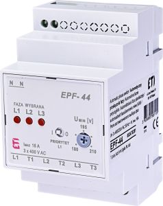 Реле автоматичного вибору фаз EPF-44 230/400 В (180-210 В AC) - реле автоматичного вибору фаз застосовуються з метою забезпечення безперебійного живлення однофазного навантаження (обладнання) при зниженні напруги або обриву однієї або двох фаз трифазної мережі живлення. Має можливість вибору пріоритетної фази. Реле EPF-44 має незалежні виходи, які дають можливість підключення контакторів для збільшення струму навантаження (пристроїв) понад 16A (AC1).