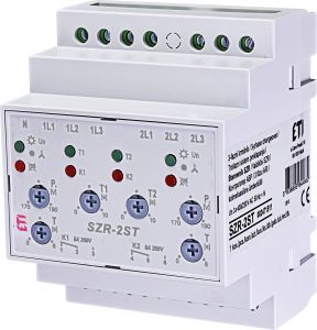 Реле автоматичного включення резерву SZR-2ST - реле автоматичного ввімкнення резерву застосовуються для перемикання живлення з основного джерела живлення на резервний (і навпаки) при зниженні напруги, асиметрії чи неправильній послідовності фаз. Тип використання АВР - «Мережа-Мережа». Реле керує увімкненням/вимкненням контакторів.