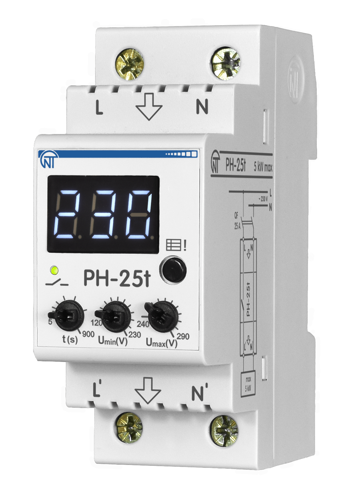 Реле напруги РН-25t призначене для захисту побутового електрообладнання (холодильників, кондиціонерів, пральних машин, теле-, відео- та аудіотехніки і т. п.) та промислового (у складі щита управління та комутації; як складова частина агрегату, як-от промисловий холодильник, станок і т.д.) від недопустимих коливань напруги в мережі і наслідків обриву нейтралі. Виріб розрахований на струм навантаження до 25 А.