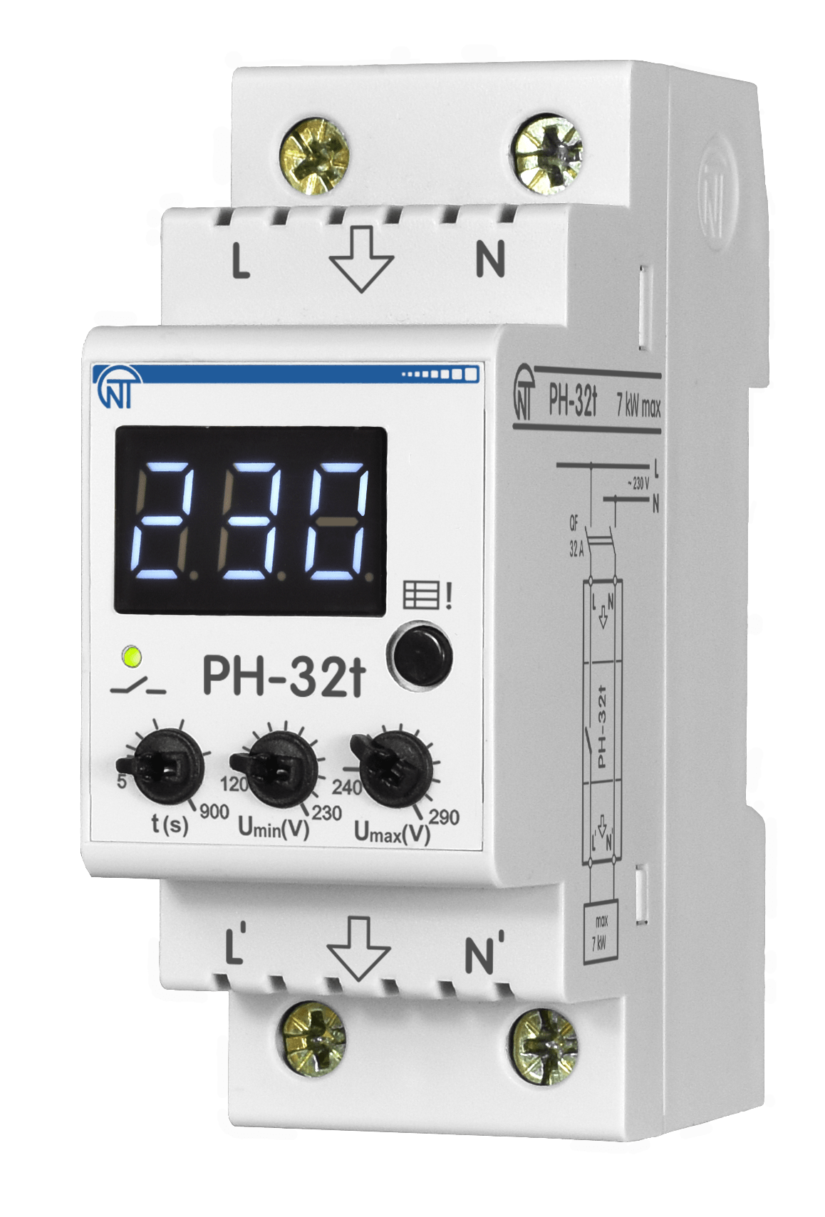 Реле напруги РН-32t призначене для захисту побутового електрообладнання (холодильників, кондиціонерів, пральних машин, теле-, відео- та аудіотехніки і т. п.) та промислового (у складі щита управління та комутації; як складова частина агрегату, як-от промисловий холодильник, станок і т.д.) від недопустимих коливань напруги в мережі і наслідків обриву нейтралі. Виріб розрахований на струм навантаження до 32 А.