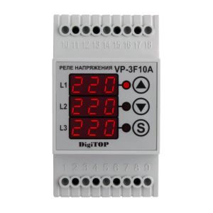 Трифазне реле напруги VP-3F10A призначене для захисту трифазних споживачів від перепадів напруги, асиметрії фаз, зникнення фаз, контролю порядку чергування фаз. У приладі передбачена можливість вибору режиму роботи – трифазний (синхронний режим) або три незалежних однофазних реле (асинхронний режим). Пристрій запобігає виходу з ладу і продовжує термін експлуатації електрообладнання. При використанні контактора, реле можна застосовувати для захисту більшого навантаження – відповідної потужності контактора. Налаштування будуть збережені, навіть в разі відключення електроенергії. Негорючий, зносостійкий і ударостійкий корпус найкращим чином забезпечує надійний захист пристрою і безпеку його експлуатації.