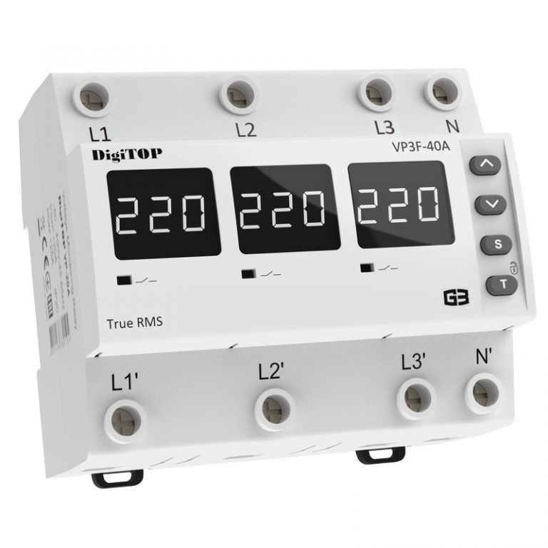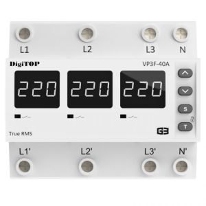 Трифазне реле напруги VP-3F40А M6W призначене для захисту трифазних споживачів від перепадів напруги, асиметрії фаз, зникнення фаз, контролю порядку чергування фаз. Пристрій запобігає виходу з ладу і продовжує термін експлуатації електрообладнання. З можливістю вибору режиму роботи як трифазне або як три незалежних однофазних реле. Налаштування будуть збережені, навіть в разі відключення електроенергії.