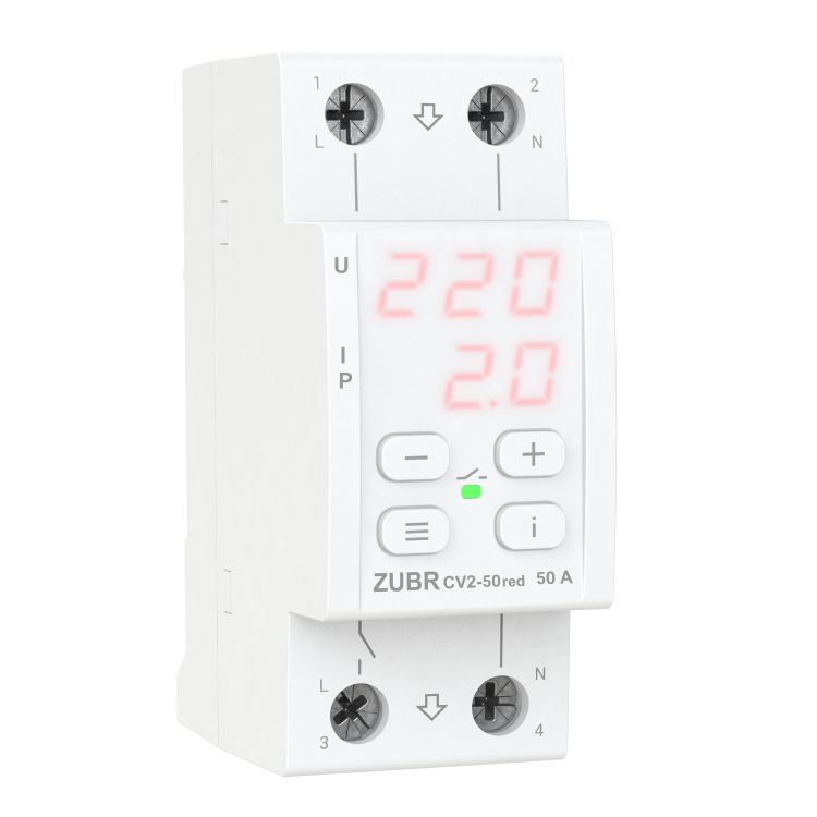 ZUBR CV2-50 red захищає обладнання від високої та низької напруги, обриву нуля, а також обмежує споживання струму чи потужності. При відхиленнях напруги ZUBR вимкне навантаження, а при перевищенні струму або потужності навантаження відключиться через заданий час затримки.