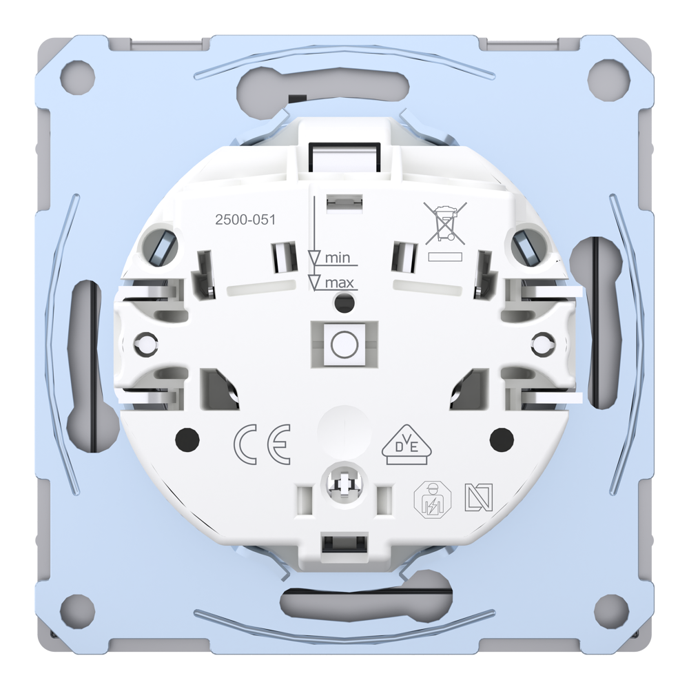 Ключові особливості: серія Merten, розетка, колір нержавіюча сталь, матеріал термопластик, габарити 71 мм × 71 мм × 45 мм.