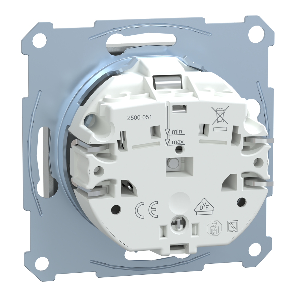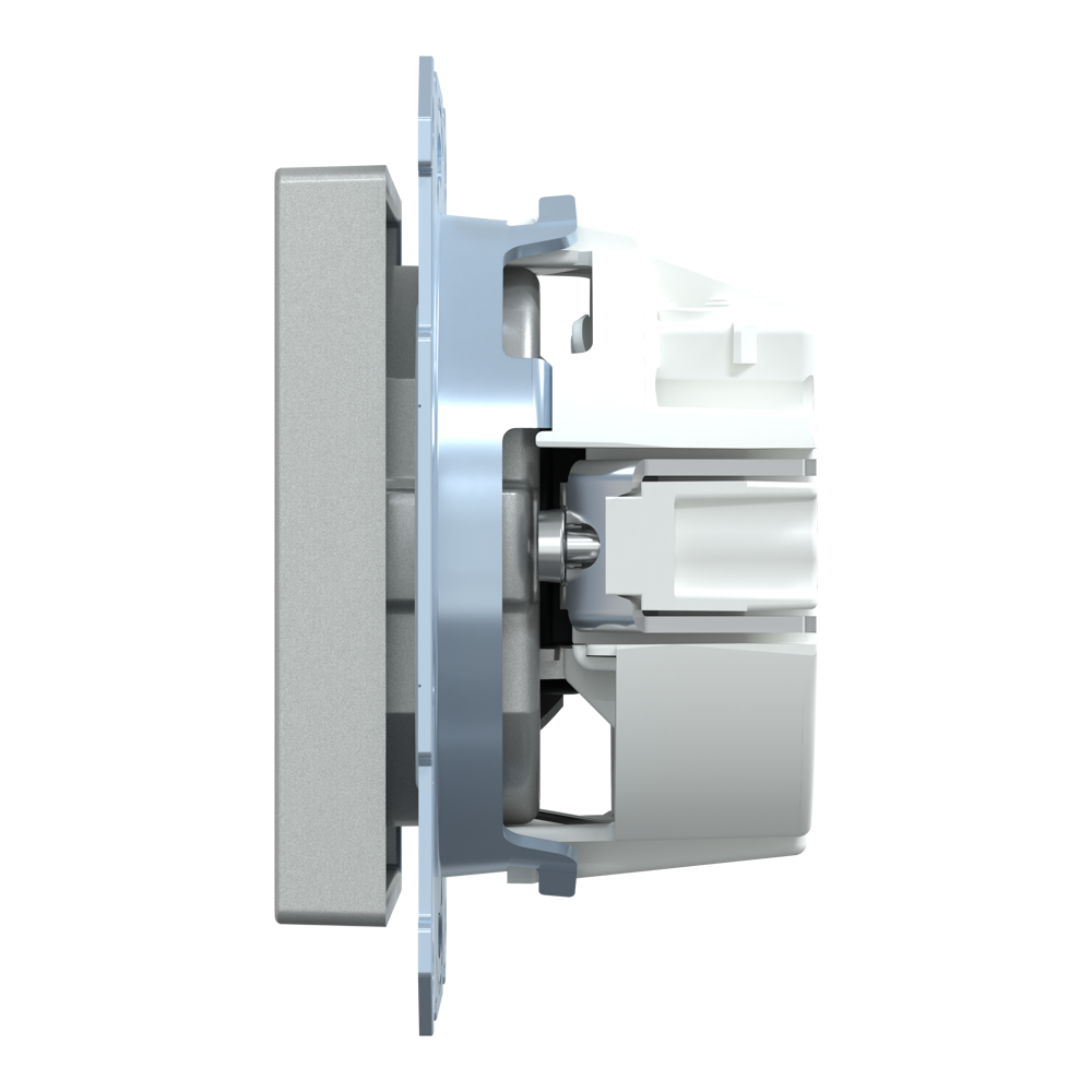 Ключові особливості: серія Merten, розетка, колір алюмінієвий, матеріал термопластик, габарити 71 мм × 71 мм × 4 мм.