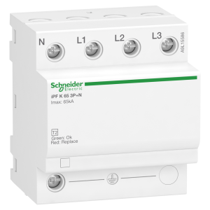 Acti9 iPF K 65 це пристрій захисту від імпульсних перенапруг (Пзіп) для трьохполюсних установок. Максимальний струм розряду Imax становить 65 кА. Номінальний струм розряду становить 20 кА. Серія багатополюсних Пзіп адаптована для систем заземлення TT, TN-S, TN-C. Вхідний захист від перенапруг типу 2 рекомендується для дуже високого рівня ризику. Максимальна безперервна робоча напруга Uc у звичайному режимі (між нейтраллю та землею) становить 260 В змінного струму. Максимальна безперервна робоча напруга Uc у диференціальному режимі (між фазою та нейтраллю) становить 340 В змінного струму. Рівень захисту від підвищення напруги становить 1,5 кВ у загальному режимі (між нейтраллю та землею) і в диференціальному режимі (між фазою та нейтраллю). Номінальна робоча напруга Ue становить 230 В змінного струму або 400 В змінного струму +/- 10%. Колір продукту білий (RAL9003). Розміри: (Ш) 72 мм x (В) 81 мм x (Г) 69 мм. Вага 335 г. Ступінь захисту IP20 і IP40 при встановленні в щит. Робоча температура від -25°C до 60°C. Температура зберігання від -40°C до 85°C. Відповідає стандартам EN 61643-11 і Мек 61643-11.