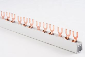 Шина з'єднувальна U 3P/63A злучна вилкова (U, FORK) мідна, відводжувані контакти якої виконані у формі роздвоєних U-подібних шпинів. Призначена для надійного і послідовного підключення автоматичних вимикачів та інших модульних електротехнічних пристроїв, з контактними групами, що обладнані гвинтами.