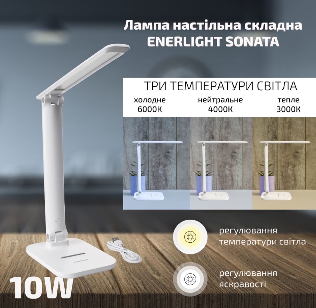 Настільний світильник SONATA вражає своєю яскравістю до 500 люмен і елегантним лаконічним дизайном, ідеальним для офісу, домашнього кабінету або робочої зони.