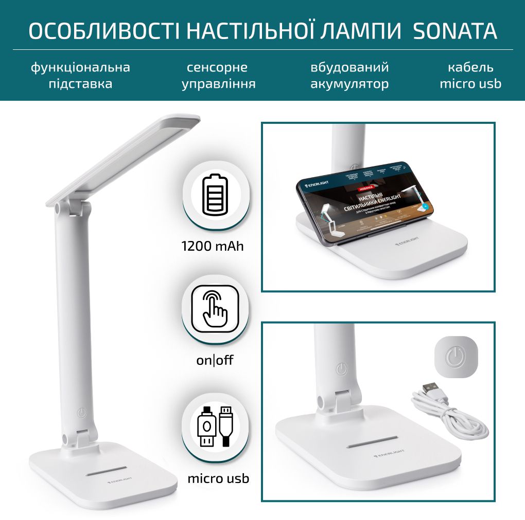 Світильник оснащений тримачем для телефону та кнопкою для регулювання яскравості і температури світіння, світильник SONATA дозволяє вам налаштувати ідеальне освітлення для навчання, роботи або відпочинку.