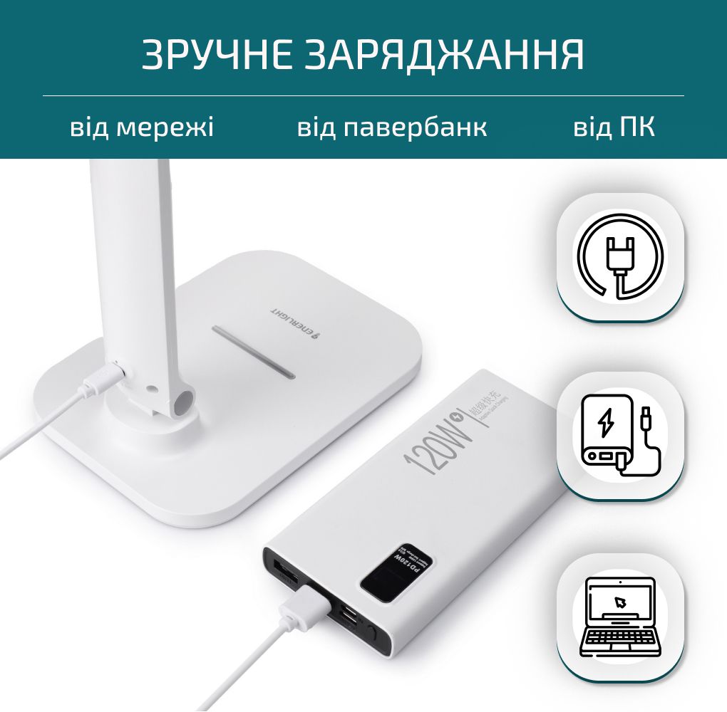 Лампа освітлює без мерехтіння, чим знижує навантаження на зір. Немає ультрафіолетового та інфрачервоного вимпромінювання. Лампа оснащена змінним акумулятором (li-ion 3.7V, 1200 mAh), який забезпечує роботу лампи щонайменше 5 годин при середній або низькій яскравості. В комплекті постачається кабель живлення (тип micro- usb). Лампу можна заряджати від павербанка або від ноутбука. За допомогою однієї сенсорної кнопки можливо налаштувати яскравість та температуру світла.
