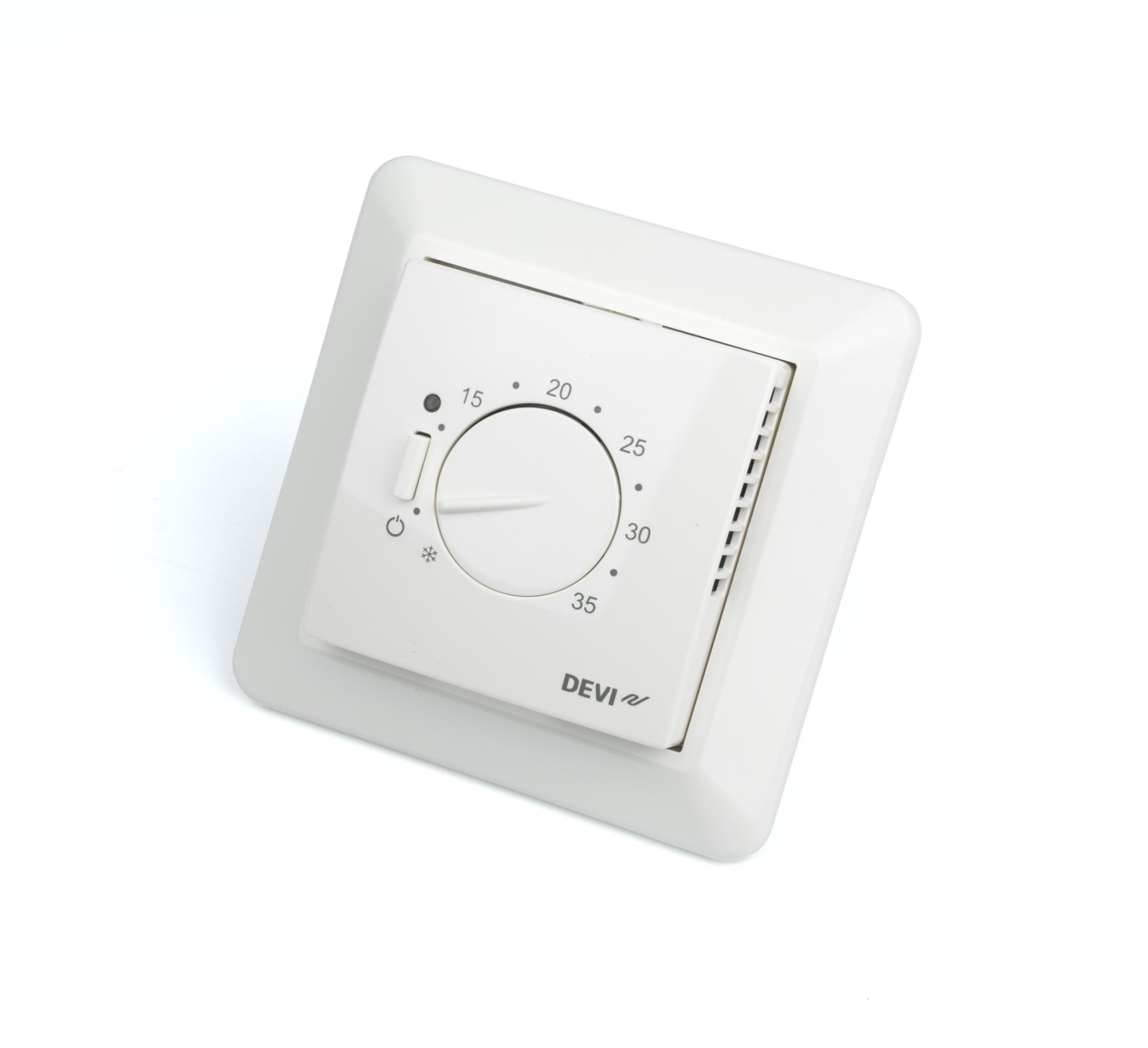 Терморегулятор DEVIreg 531 (від +5 до +35) Електронні терморегулятори застосовуються для систем комфортного підігріву поверхні «Тепла підлога» або повного опалення приміщень. Конструкція корпусу передбачає встановлення на стіну в монтажній коробці. Двополюсний вимикач живлення. Всі терморегулятори мають контроль цілісності датчика температури на проводі, індикація – блимаючий зелений світлодіод, при цьому напруга на навантаження не подається.