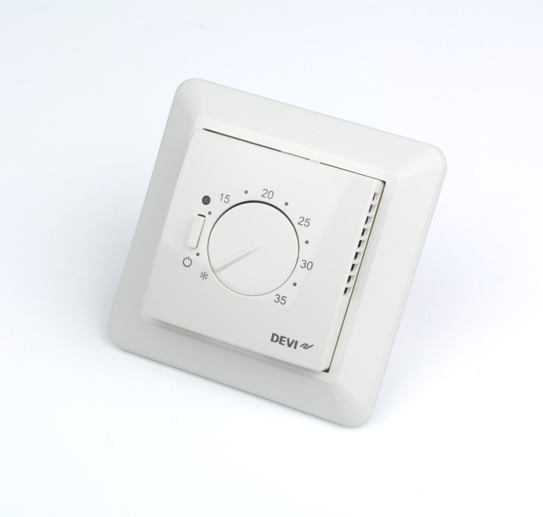 Терморегулятор DEVIreg 532 (від +5 до +35) Електронні терморегулятори застосовуються для систем комфортного підігріву поверхні «Тепла підлога» або повного опалення приміщень. Конструкція корпусу передбачає встановлення на стіну в монтажній коробці. Двополюсний вимикач живлення. Всі терморегулятори мають контроль цілісності датчика температури на проводі, індикація – блимаючий зелений світлодіод, при цьому напруга на навантаження не подається.