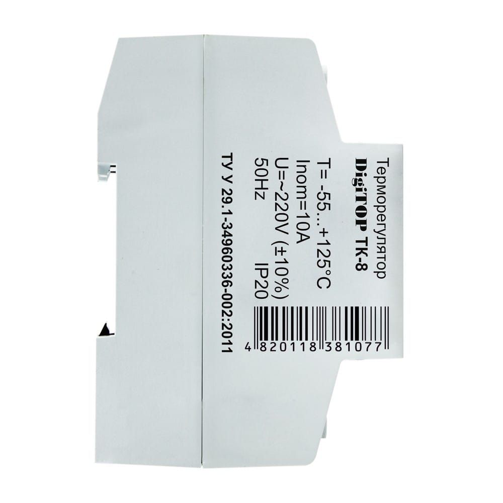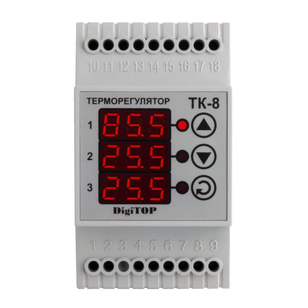 Терморегулятор (регулятор температури) ТК-8 призначений для контролю і підтримки температури (діапазону температур) в приміщеннях шляхом включення і відключення нагрівального або охолоджувального обладнання по трьом виходам реле. Терморегулятор відслідковує температуру по трьом незалежним каналам (датчикам) з відображенням поточного значення на цифрових світлодіодних індикаторах. Датчики температури (поставляються в комплекті, довжина кожного датчика – 1,5 метри) розташовуються в тій зоні, де необхідно підтримувати температурний режим. У разі необхідності кабель датчика можна наростити до 100 метрів провідником типу “кручена пара”. Три незалежних терморегулятора малої потужності в одному корпусі дозволяють економити місце в електричному щитку і управляти температурою в декількох зонах з одного пристрою або використовувати в одній зоні для триступеневого управління навантаженням. Негорючий, зносостійкий і ударостійкий корпус найкращим чином забезпечує надійний захист пристрою і безпеку його експлуатації.