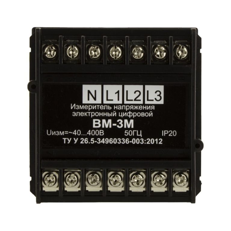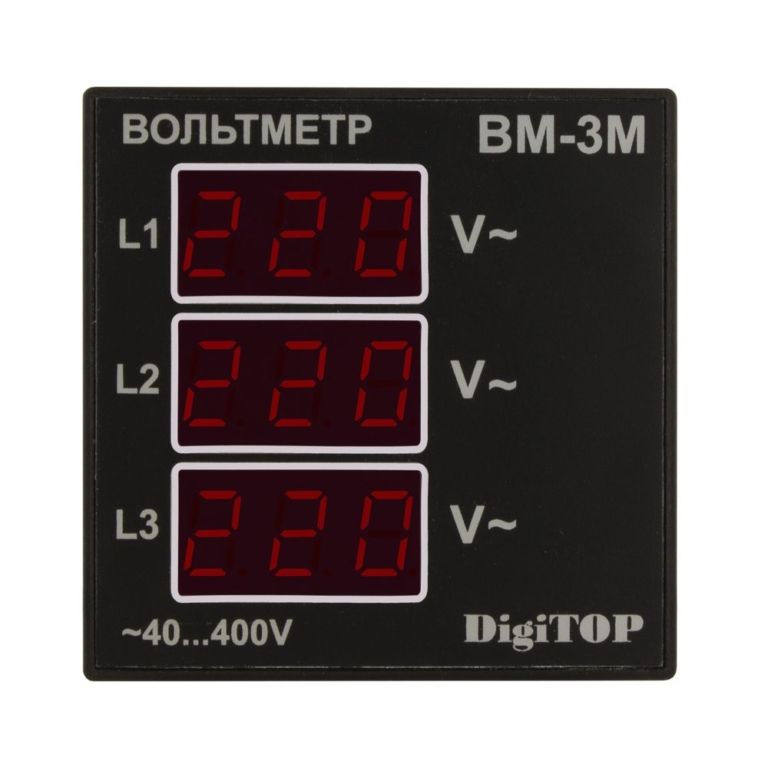 Вольтметр ВМ-3М призначений для вимірювання діючого значення напруги змінного струму частотою 50 (±1) Гц в трифазній мережі, з відображенням поточних значень на цифрових світлодіодних індикаторах. Щитове виконання. Негорючий, зносостійкий і ударостійкий корпус найкращим чином забезпечує надійний захист пристрою і безпеку його експлуатації.