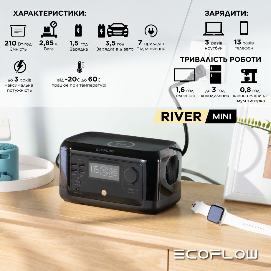 EcoFlow River mini — це портативний зарядний пристрій, що можна використовувати будь - де. Він портативний, його можна переносити з собою завжди або тримати в автомобілі. Ємність зарядної станції — 210 Вт⋅год. River mini може живити 7 пристроїв одночасно.