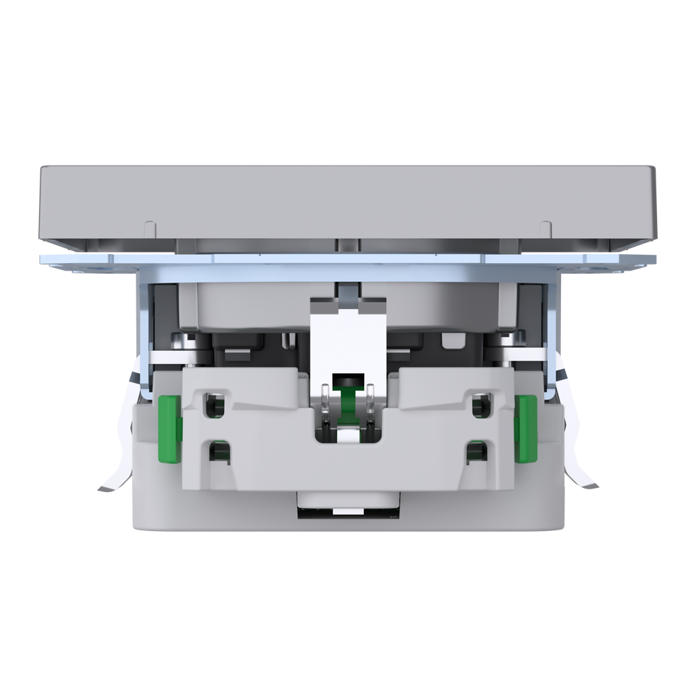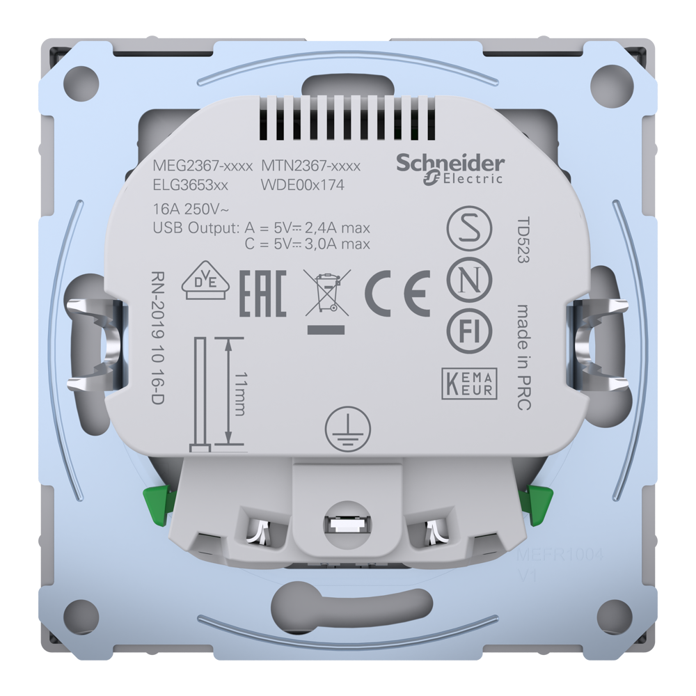 Ключові особливості: серія Merten, зарядний пристрій USB + розетка, колір нержавіюча сталь, матеріал термопластик, габарити 71 мм × 71 мм × 44 мм.