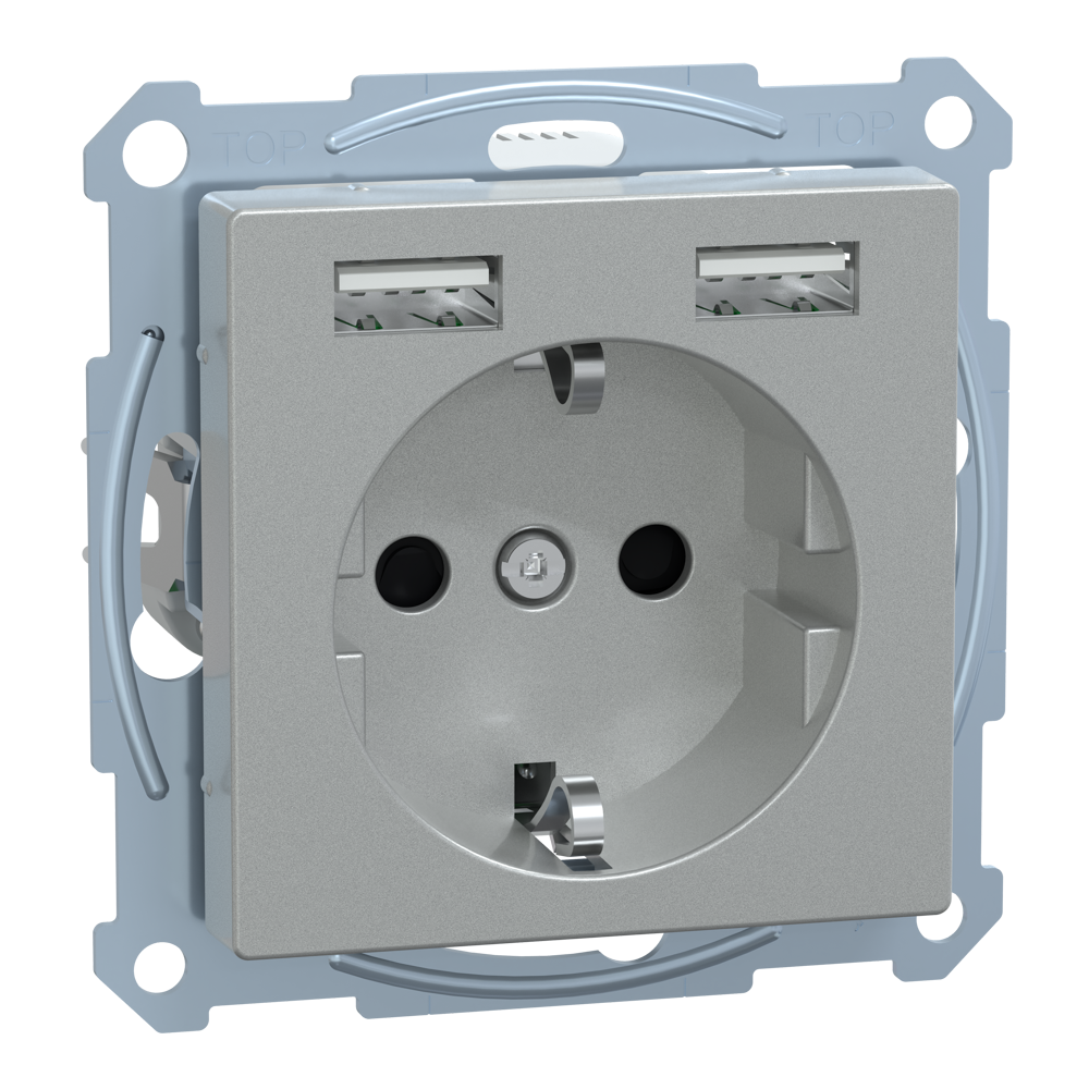 Зарядний пристрій USB + розетка, Merten, Розетка Schuko з 2 USB 2, алюмінієвий, Schneider Electric, [MTN2366-0460]