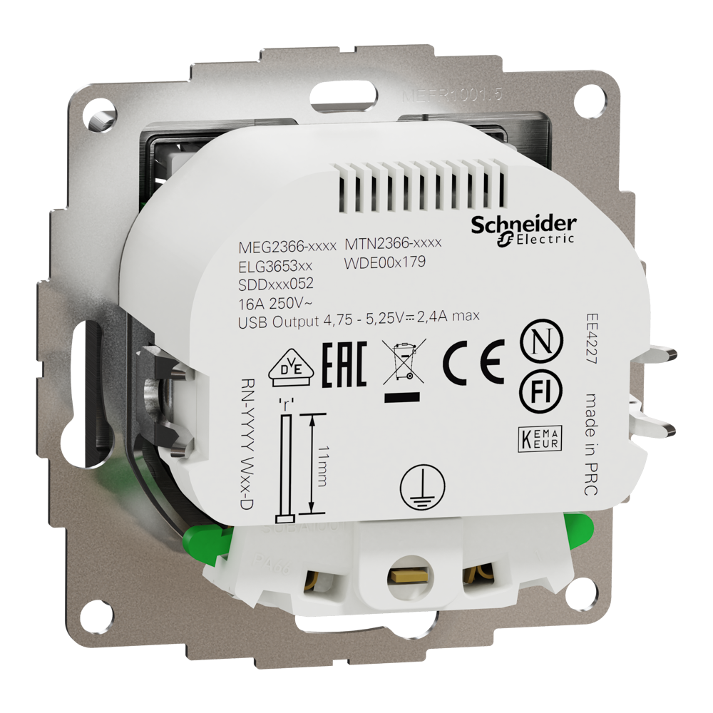 Зарядний пристрій USB + розетка, Sedna Design&Elements, Розетка з заземленням + 2 USB тип А Матовий алюміній Sedna Elements, матовий алюмінієвий, Schneider Electric, [SDD170052]