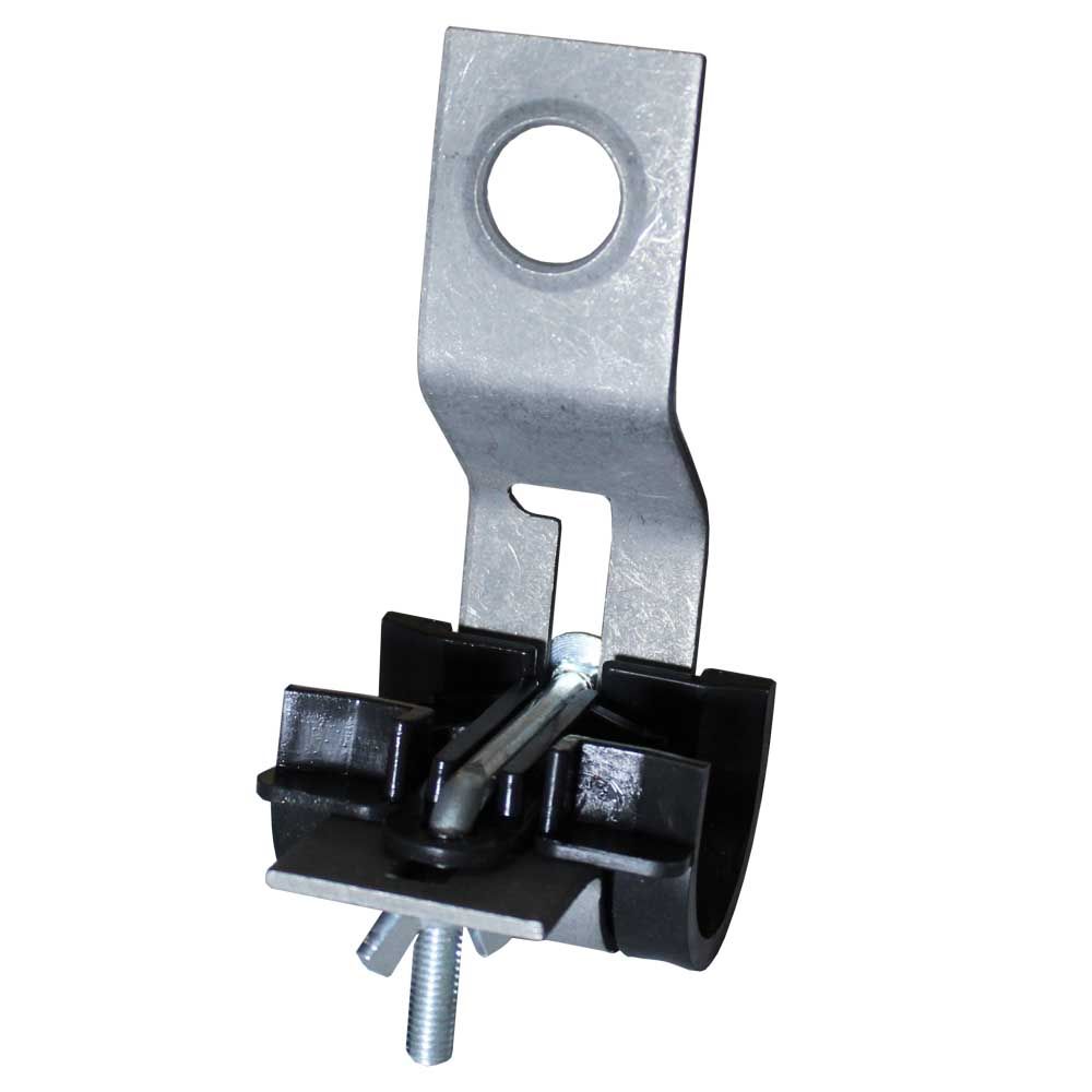 Універсальний підтримуючий (підвісний) затискач із затяжним болтом використовується для кріплення дроту на проміжних і кутових опорах при кутах відхилення лінії до 30º. Фіксація дроту без допомоги монтажного інструменту. Кронштейн - сталь 2.5-3 мм.
